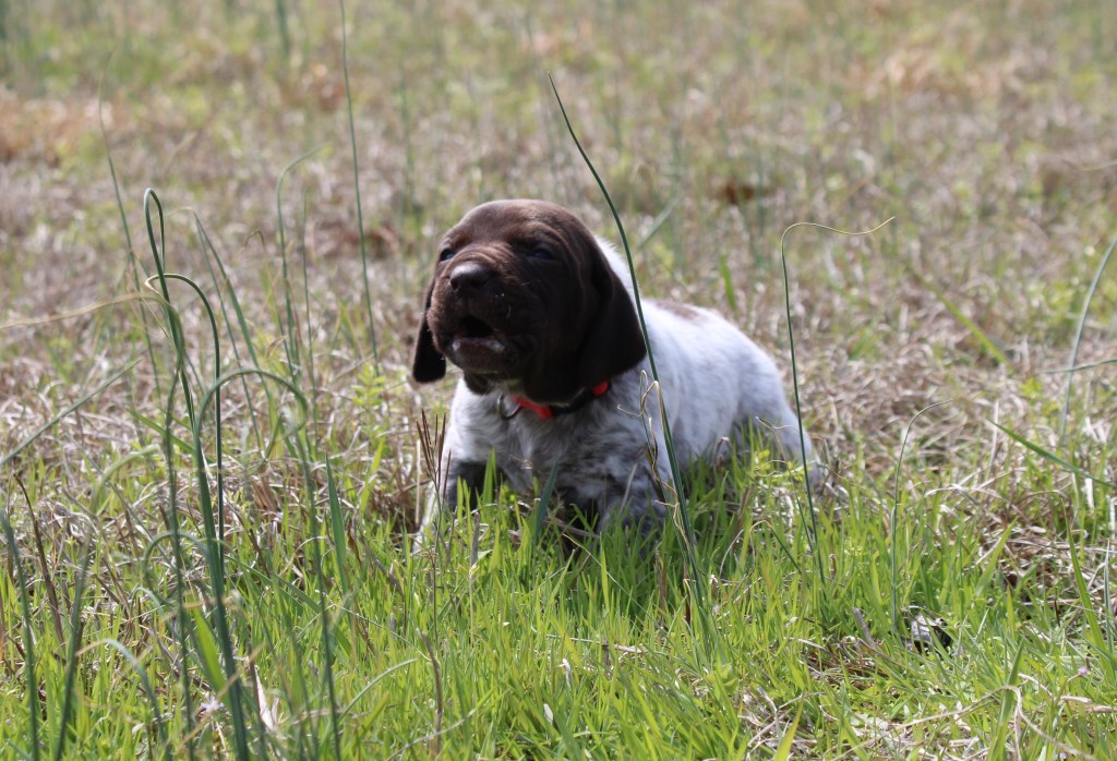 We live on a wooded 30 acre property. The dogs all have house time (just not at the same time…we aren’t crazy). Everyone has their own space, but enjoy their time playing and exploring with each other. Our dogs come from hunting pedigrees, so if you are wanting to hunt, the genetics are there. We encourage you to reach out to a trainer or, work with the pup yourself!